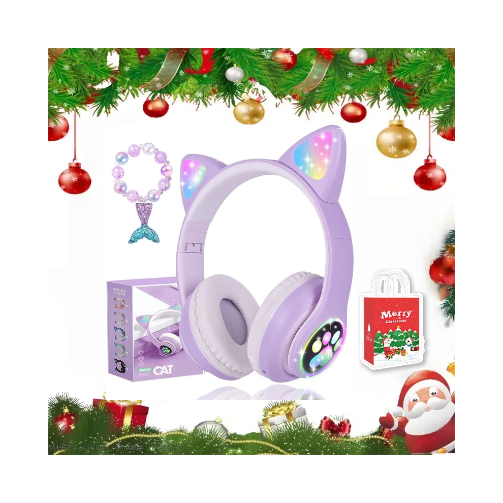 (Purple)Christmas Gifts Bonus Box Wireless Headphones for Kids, Cat Ear LED Light Up Bluetooth Kids Headphones with Microphone for School/Travel/