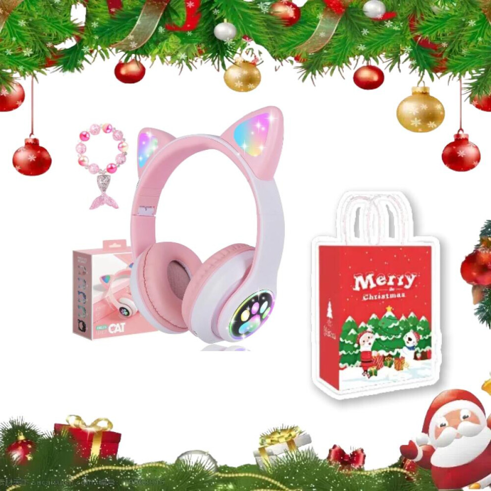 (Pink)Christmas Gifts Bonus Box Wireless Headphones for Kids, Cat Ear LED Light Up Bluetooth Kids Headphones with Microphone for School/Travel/Sp