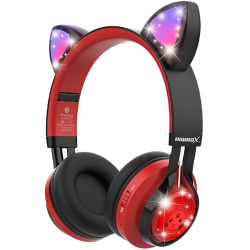 Riwbox CT-7 Cat Ear Kids Bluetooth Headphones, LED Light Up Bluetooth Wireless Over Ear Headphones with Microphone and Volume Control Compatible for Travel/School/Smartphones/Laptop/PC/TV (Red&Black)