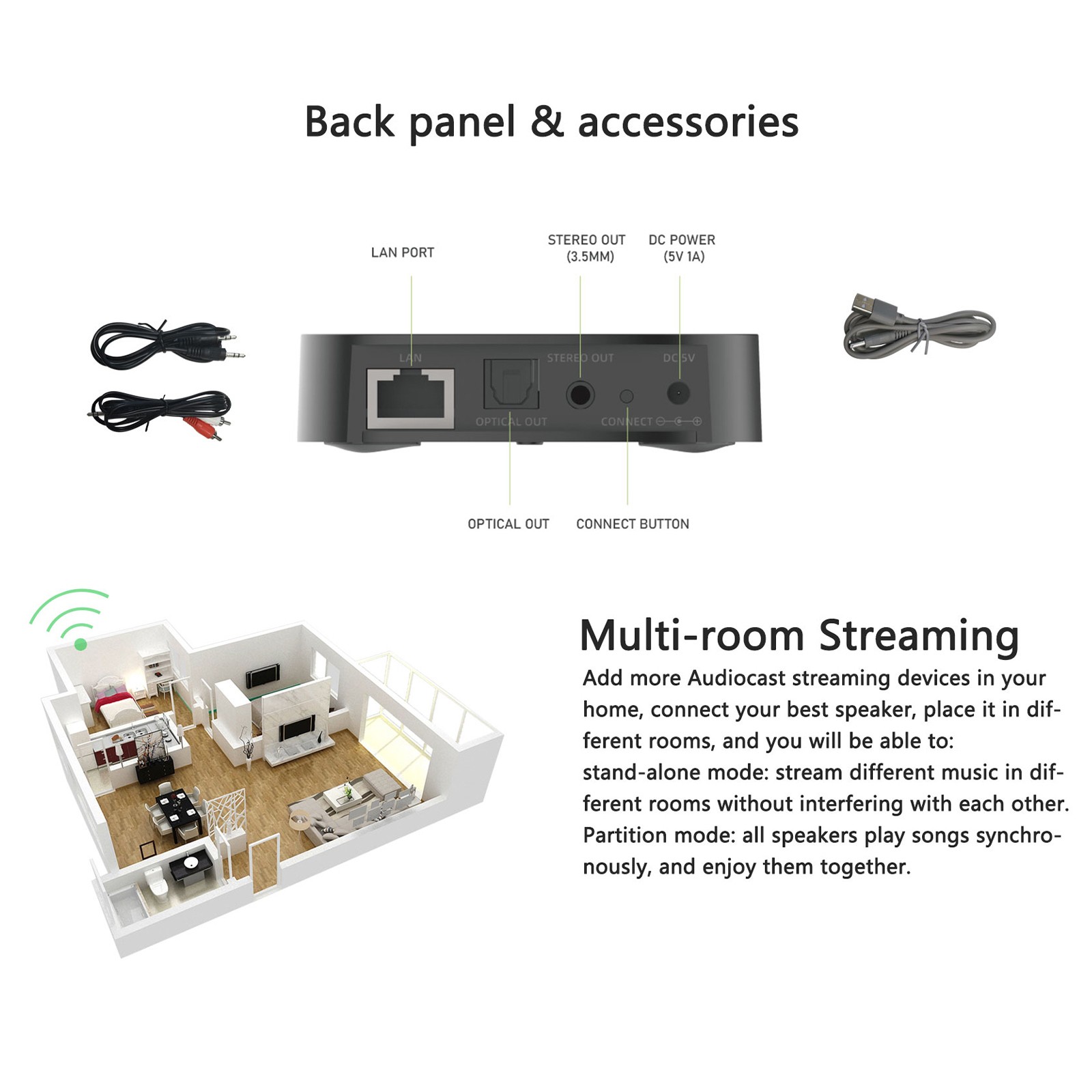 Multi Room Supported Audio System For Home Entertainment,Wireless Audio Adapter With Stronger Signal Range Supports Streaming To Multiple Speakers