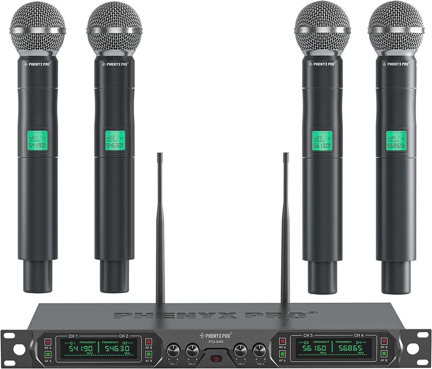 Phenyx Pro Wireless Microphone System, 4-Channel UHF Wireless Mic, Fixed Frequency Metal Cordless Mic with 4 Handheld Dynamic Microphones, 260ft Range, Mics for Singing, Church(PTU-5000-4H)