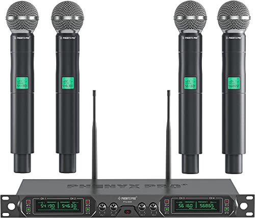 Phenyx Pro Wireless Microphone System, Metal Wireless Mic Set with 4 Cordless Mics, 4x25 UHF Adjustable Frequencies, 200ft Range, Dynamic Microphones for Singing, Karaoke, Church, DJ (PTU-5200)