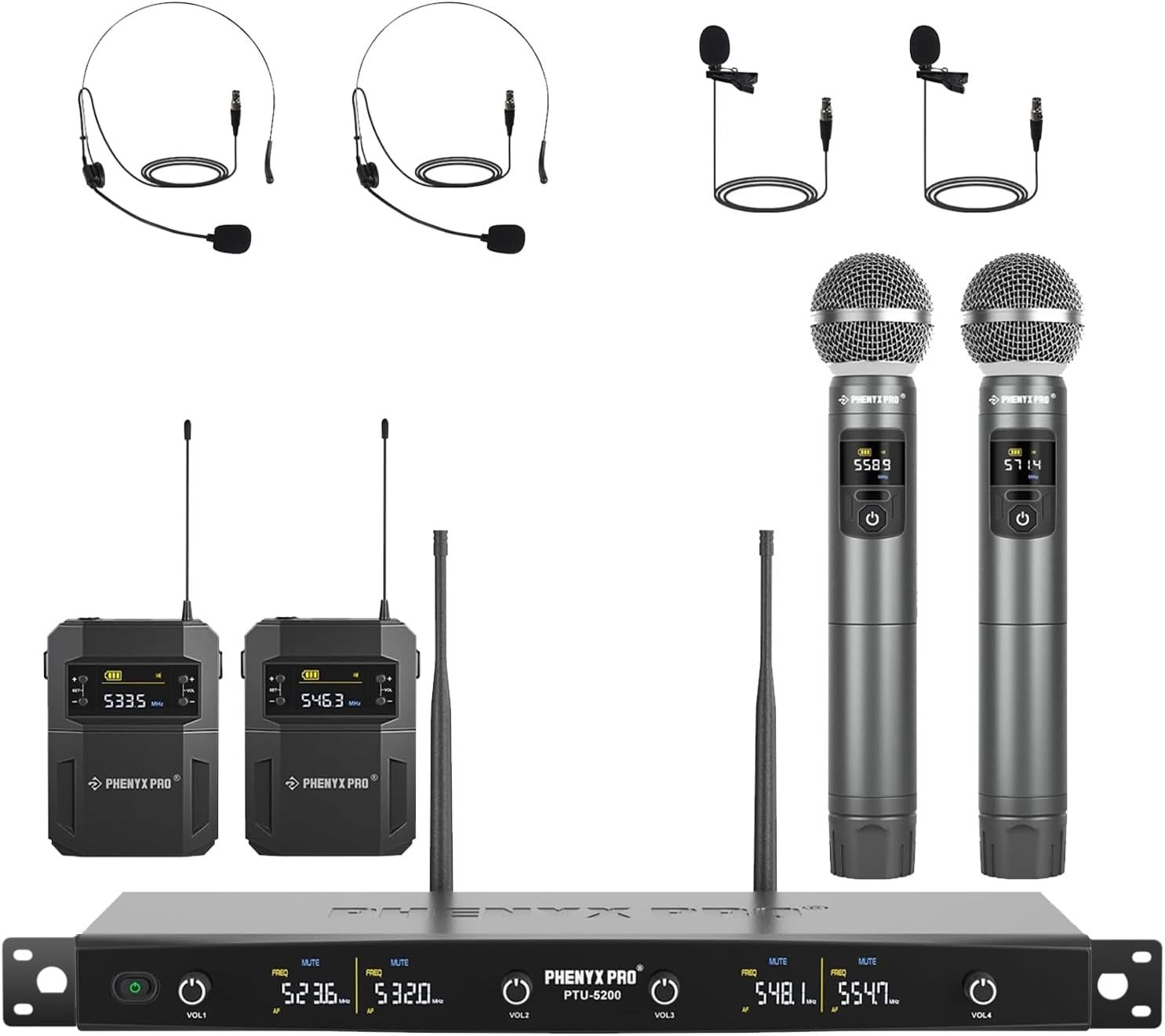 Phenyx Pro Wireless Microphone System, 4-Channel Wireless Mic Set with Handheld/Bodypack/Headset/Lapel Mics, Cordless Mic for Singing, Karaoke, Church (PTU-5200B)