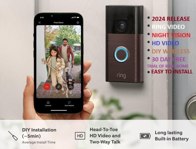 Ring Battery Video Doorbell (2024 release) | DIY Wireless Video Doorbell Camera I Head-To-Toe View, HD Video | Easy to install (5 min) | With Built-in Battery I 30-day free trial of Ring Home