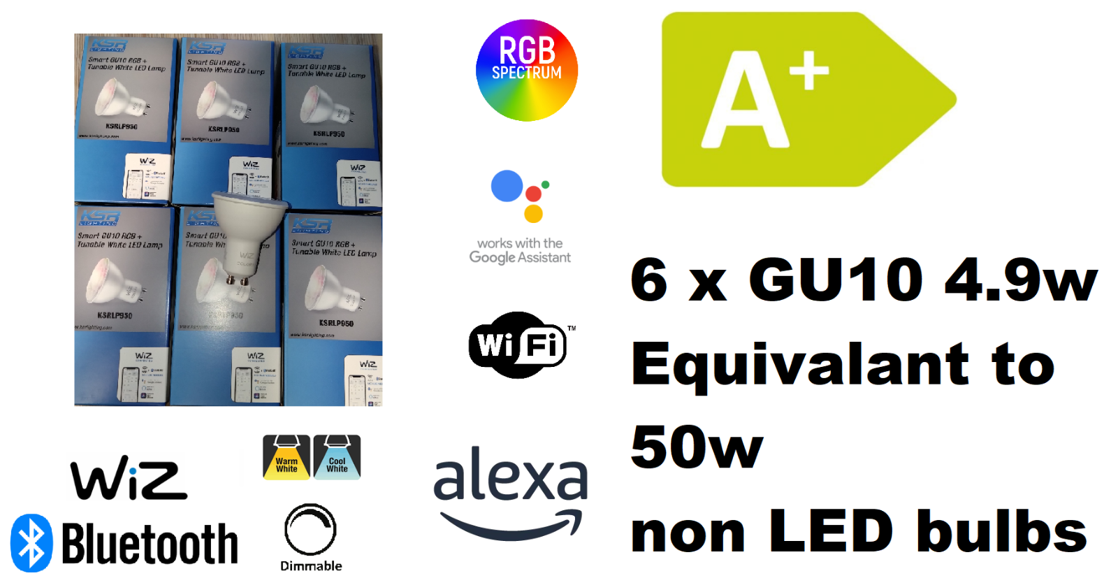 6 X Wiz GU10 50W = 4.9w Colour Smart LED Wi-Fi Bulb + RGBW + DIMMABLE BLUETOOTH