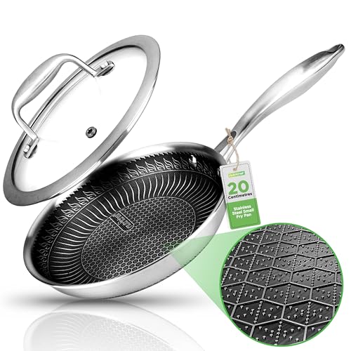 Nutrichef Stainless Steel Frying Pan, 20cm Frying Pan, Triply Kitchenware Stir Fry Pans Kitchen Cookware with Dakin Etching, Scratch-Resistant, Non Stick Wok with Lid, Honeycomb Fire Textured Pattern