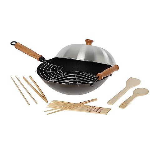 Honey Can Do Joyce Chen Professional Series 14-Inch 10-Piece Wok Set, Includes Carbon Steel Nonstick Wok Pan with Lid and Maple Handles, Tempura Rack, Utensils, and Recipe Book