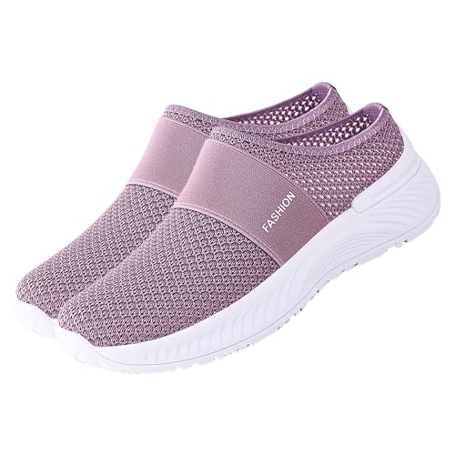 Womens Wide Fit Trainers Breathable Knit Mesh Mules Sneakers Slip on Orthopedic Running Shoes Women Wedge Mule Walking Shoes Lightweight Arch Support Half Drag Casual Shoes (Purple-a, 7)