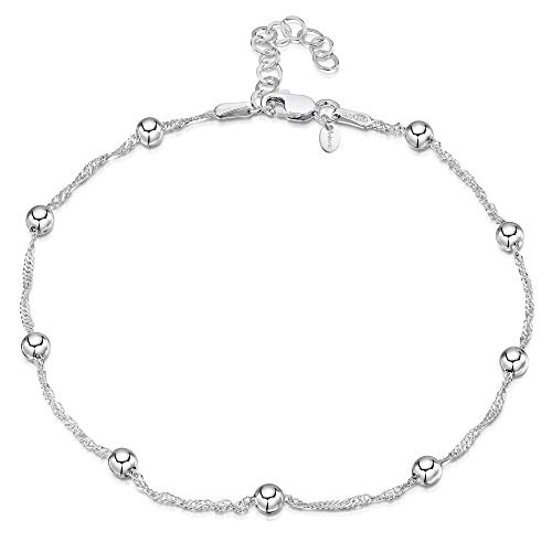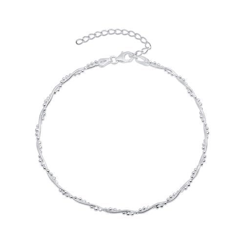 CASSIECA Silver Anklets for Women, 925 Sterling Silver Ankle Bracelets, Dainty Waterproof, Adjustable, Layered Anklet, Square Point Beaded Link Ankle Beach Foot Jewelry