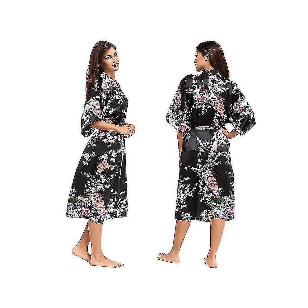 (XL, Black) SNQTV-Womens Floral Printed Soft Satin Kimono Dressing Gown Wedding Bathrobe Sleepwear