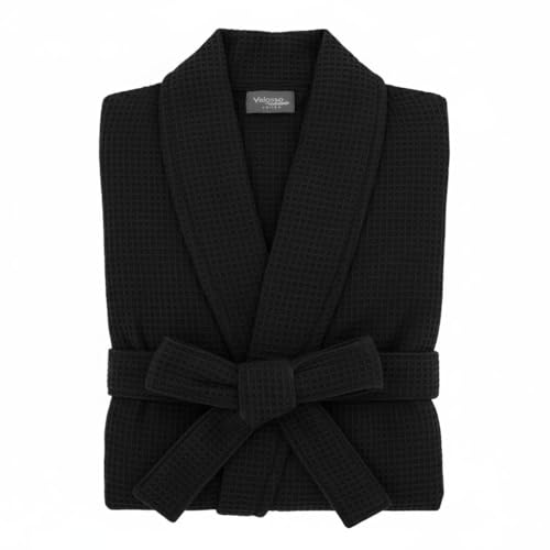 Velosso 100% Cotton Waffle Textured Hotel Bathrobes Mens Womens Unisex Soft Hotel Dressing Gown, Kimono, Bathrobe, Loungewear (UK, Numeric, 20, Regular, Regular, Black)