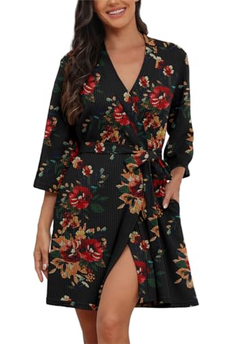 PrinStory Women'S Robes Lightweight Women Dressing Gown Soft Waffle Bathrobe Thigh Length Kimono Robe Nightwear Nightgowns (Floral Print Robes Red Brown Black, M)