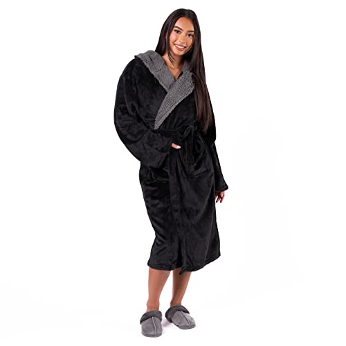 OHS Womens Dressing Gowns Teddy Fleece Black, Warm Cosy Fluffy Dressing Gown Bathrobes Women Hooded Luxury Oversized Ladies Mens Dressing Gown, One Size