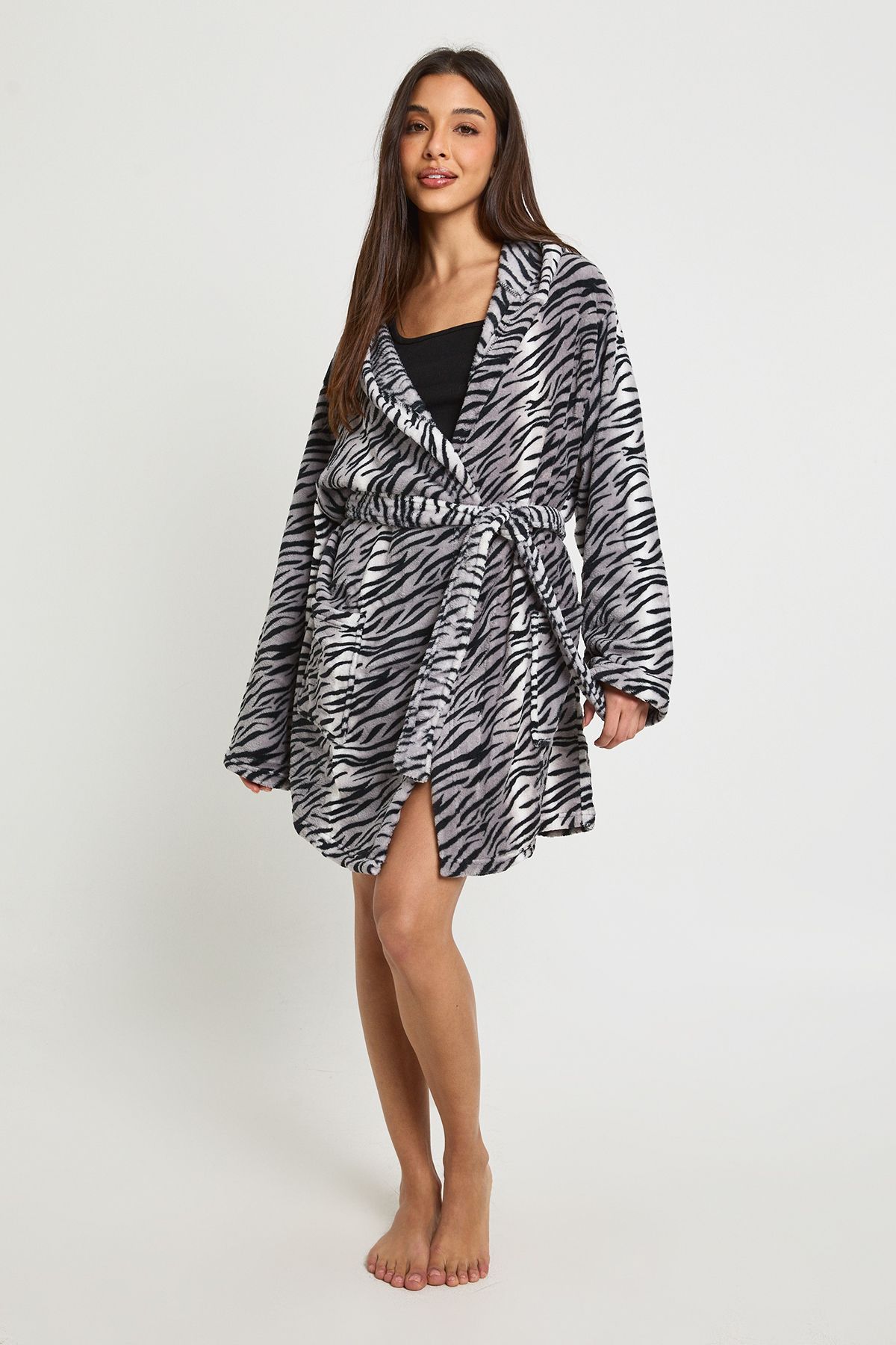 Boohoo Womens Zebra Print Hooded Mini Dressing Gown - White & Black - Size Medium