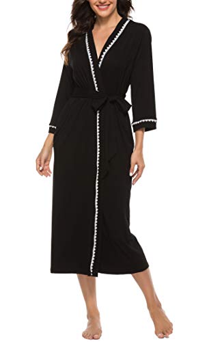 Vlazom Womens Dressing Gown Soft Kimono Robe V-Neck Long Knit Bathrobe Nightwear Sleepwear for All Seasons, Black, M