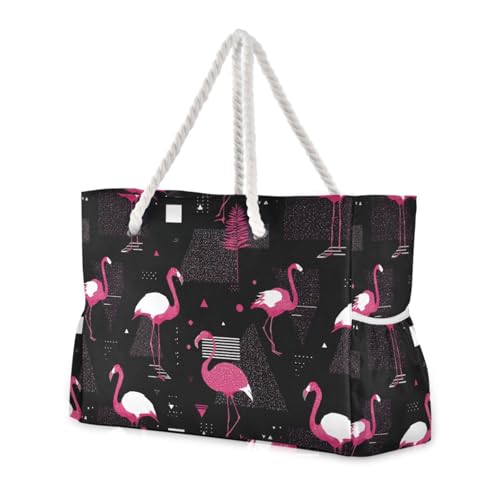 miaozhen Large Capacity large beach bag with zipper Snow Flamingo Pink and Black womens tote bags with cup holders on the side