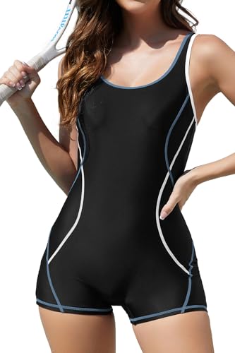 SHEKINI Womens One Piece Boyleg Swimsuit Padded Modest Athletic Racerback Swimwear Sports Swimming Costume, Black, Medium