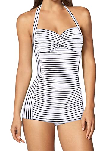 Sovoyontee Women's One Piece Tummy Control Swimwear Boyleg Ruched Swimsuit, White Stripe, Large (FBASVPSW7555-101-L)