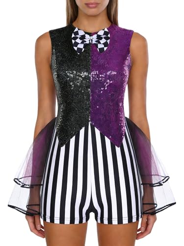 Mufeng Womens Crazy Clown Costume Seuqin Open Back Sleeveless Rompers Halloween Cosplay Outfits Purple M