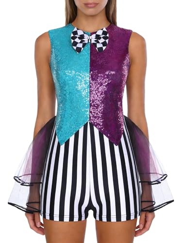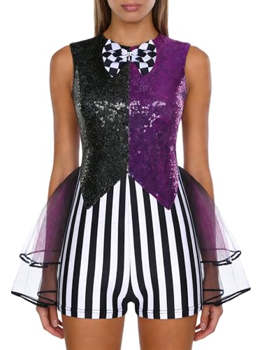 Raenseen Womens Clown Costume Color Block Sequin Tutu Skirted Bodysuit Madman Cosplay Fancy Dress Purple S