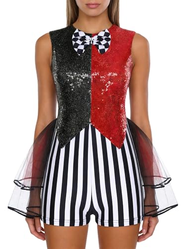 Mufeng Womens Crazy Clown Costume Seuqin Open Back Sleeveless Rompers Halloween Cosplay Outfits Red L