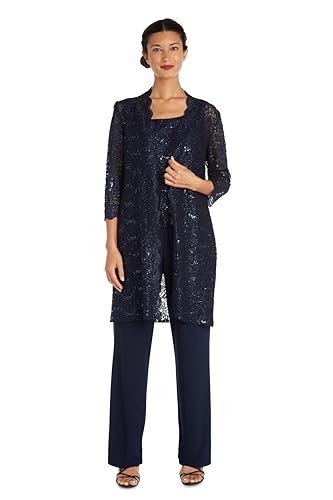R&M Richards Women's 3 PCE Laced Duster Jacket Shell and Solid Pant Formal Night Out Dress, Navy, 16