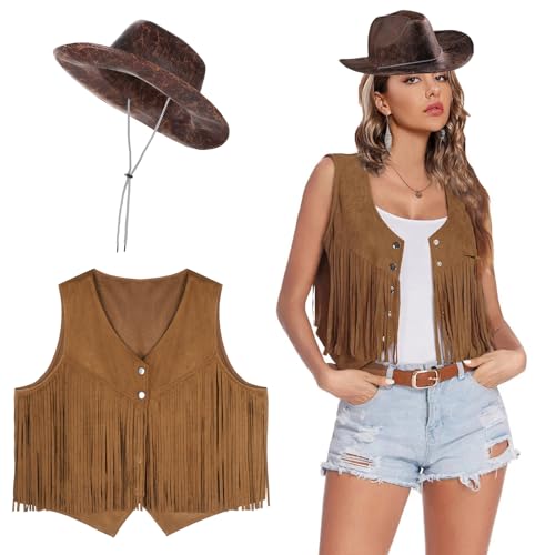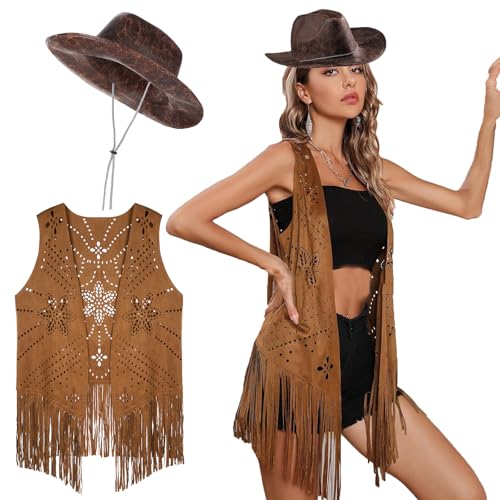Women Cowgirl Hat Western Costume Outfit Set 70s 60s Hippie Costume Set Retro Women's Tassel Vest Fringe Vest Jacket Fancy Dress Party Disco Tops Cowboy Hat Hippie Clothes Cardigan Halloween Carnival