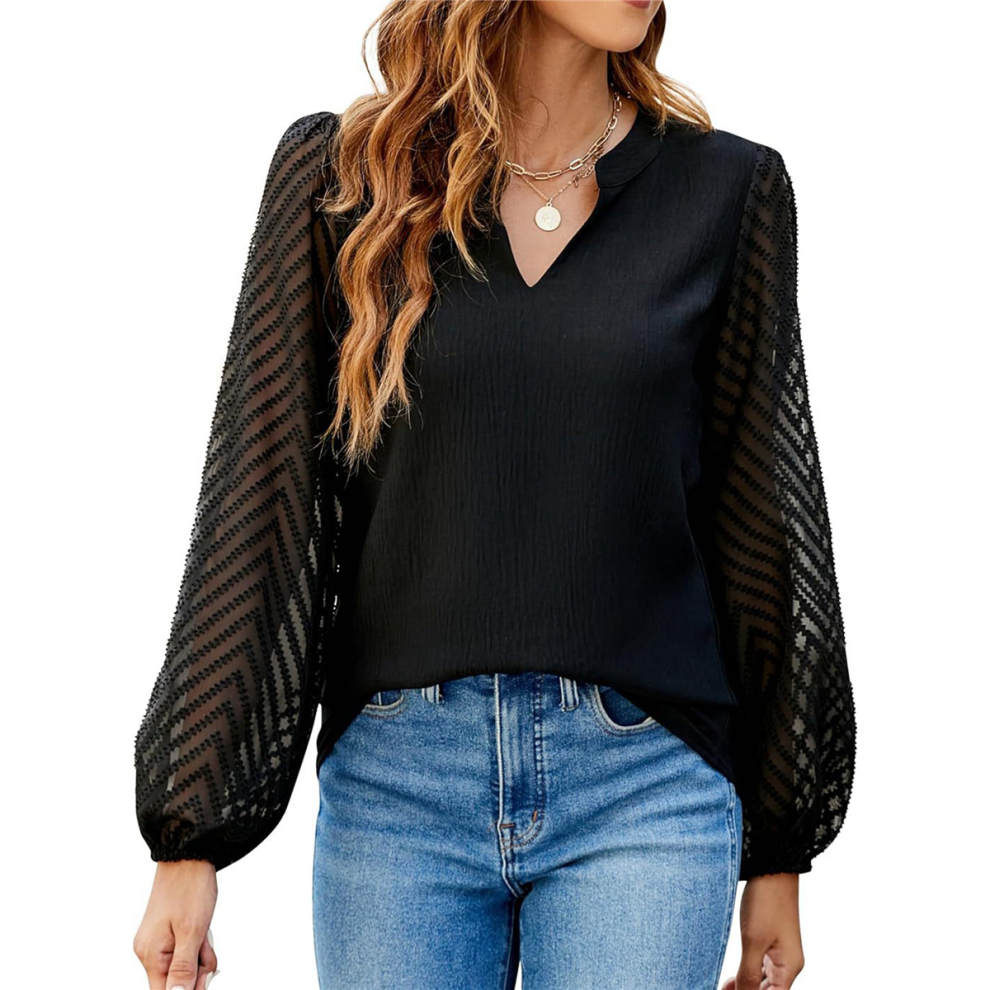 Womens Tops Dressy Casual Sheer Long Sleeve V Neck Shirts Loose Flowy Chiffon Business Work Blouses Black L