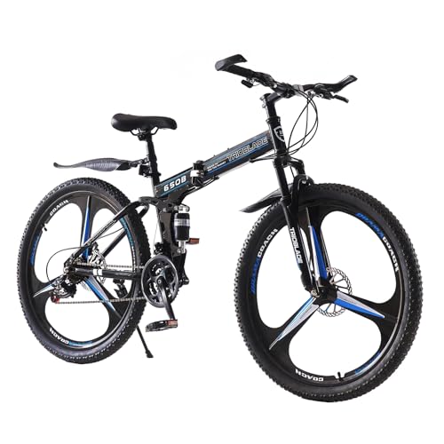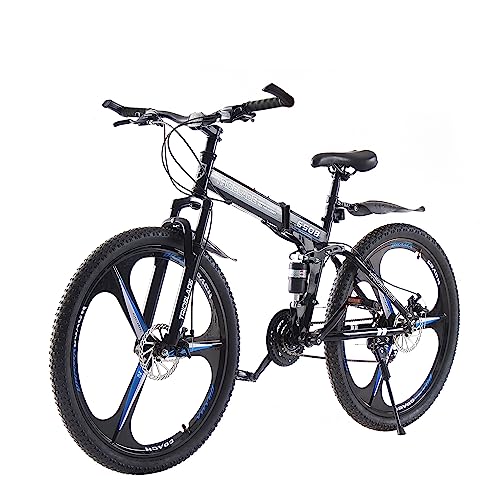 BSTSEL 26 Inch Adult Folding Mountain Bike, Dual Suspension Mountain Bikes with 26 Inches 3-Spoke Wheel, 21 Speed Mens and Womens Foldable Mountain Bicycle (26 Inch Black & Blue)