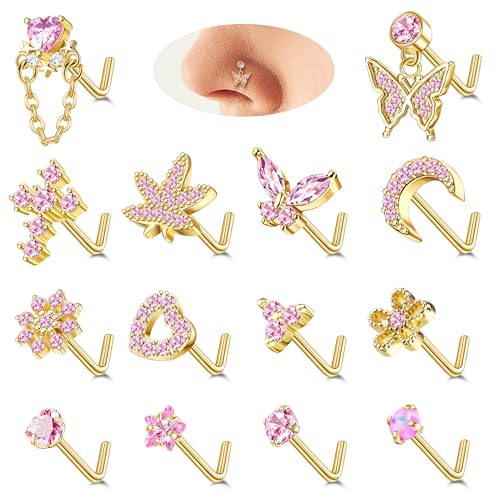 MILACOLATO 12Pcs 20G Dangle Nose Studs for Womens L Shaped 14K Gold Plated Silver Stainless Steel Corkscrew Dangly Nose Rings Stud CZ Heart Moon Butterfly Nose Piercing Jewellery for Women LG