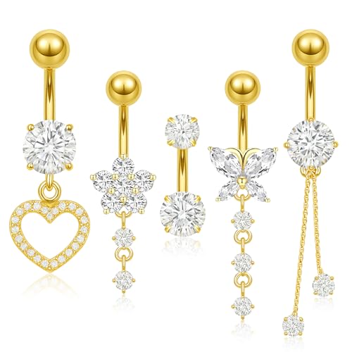5pcs Belly Button Bars Stainless Steel Dangly Belly Button Belly Button Piercing Rings Butterfly Heart Flower Tassel Navel Bars Rings Button Piercing Jewellery for Womens Girls (Gold)