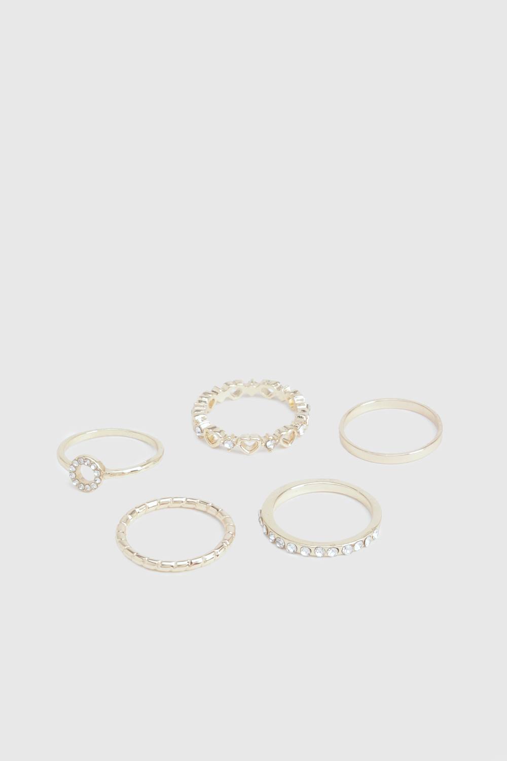 Womens Diamante Heart Detail Rings 5 Pack - Gold - S/M, Gold