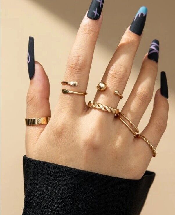 Womens Girls 6pcs Set Ball Decor Twist Decor Rings Gold Metal Jewellery Size M