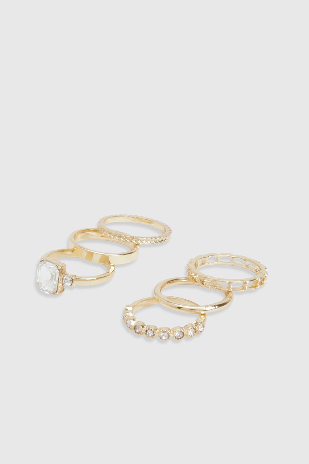 Womens Statement Diamante Rings 6 Pack - Gold - S/M, Gold