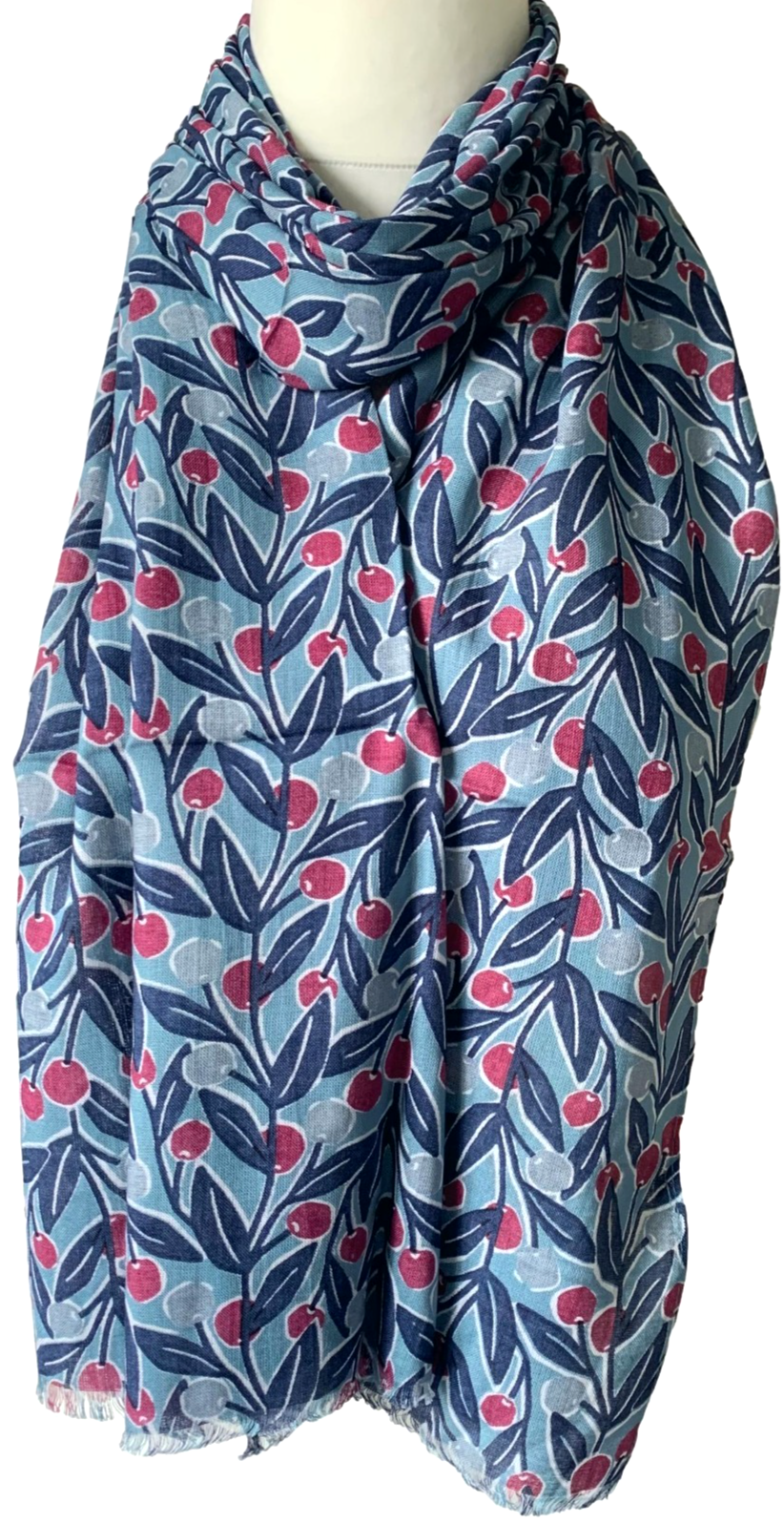 Blue Scarf Red Grey Berries Navy Leaves Floral Wrap by Peony Scarves Womens New
