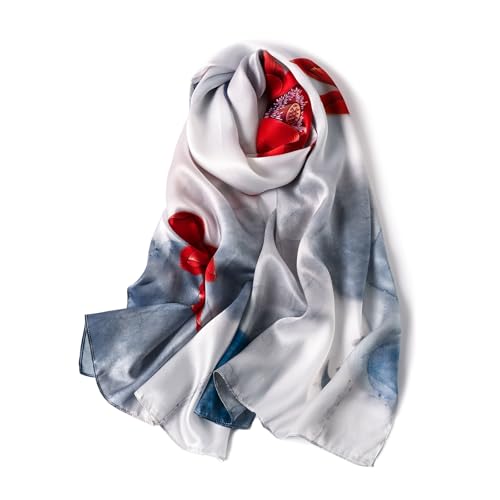 STORY OF SHANGHAI Womens 100% Natural Mulberry Silk Scarf Multi-use Scarves for Ladies,Ink and Red Lotus