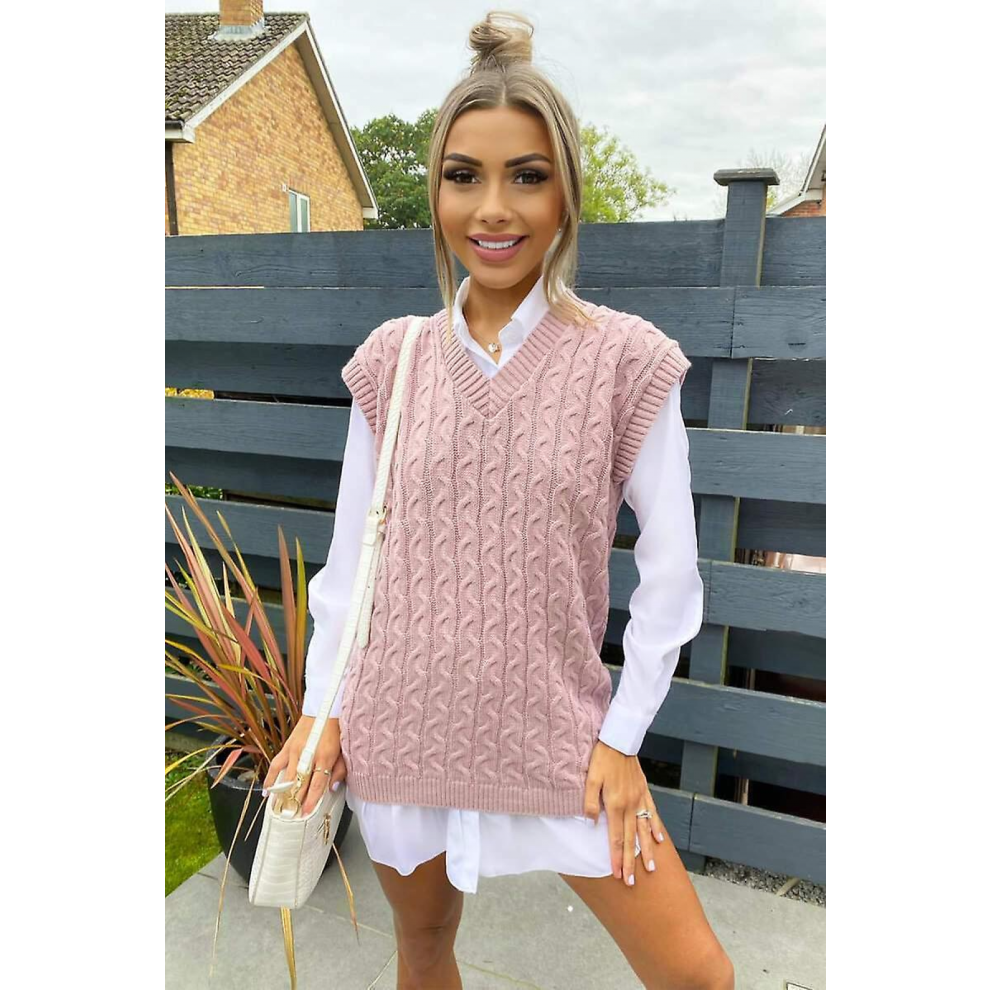 Womens Ladies Cable Knit Sleeveless Vest Knitted Jumper Tank Top Winter SweatersPinkS