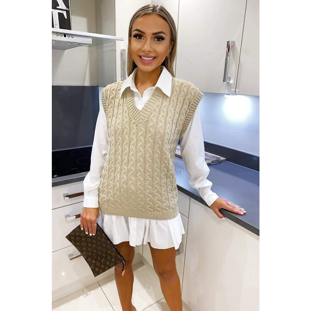 Womens Ladies Cable Knit Sleeveless Vest Knitted Jumper Tank Top Winter SweatersKhakiS