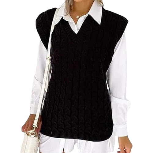 VBHJK Sweater Vest,Womens V Neck Gilets Knitted Vest Pure Color Thin Cardigan Jacket Geometric Jacquard Casual Tank Top Vintage Sweater Sleeveless Waistcoat Jumper Uniform Preppy Style,Black,L