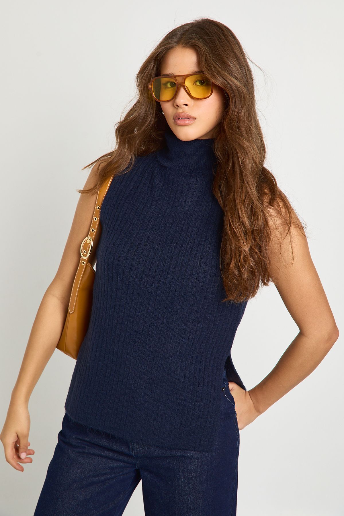 Boohoo Womens Super Soft Roll Neck Sleeveless Jumper - Navy - Size Small