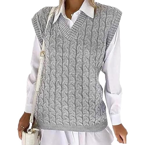 VBHJK Sweater Vest Women,Womens V Neck Gilets Knitted Vest Pure Color Thin Cardigan Jacket Geometric Jacquard Casual Tank Top Vintage Sweater Sleeveless Waistcoat Jumper Uniform Preppy Style,Gray,S