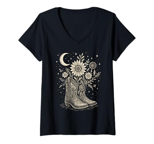 Womens Western Boots Sunflowers Moon Dreamcatcher Graphic V-Neck T-Shirt