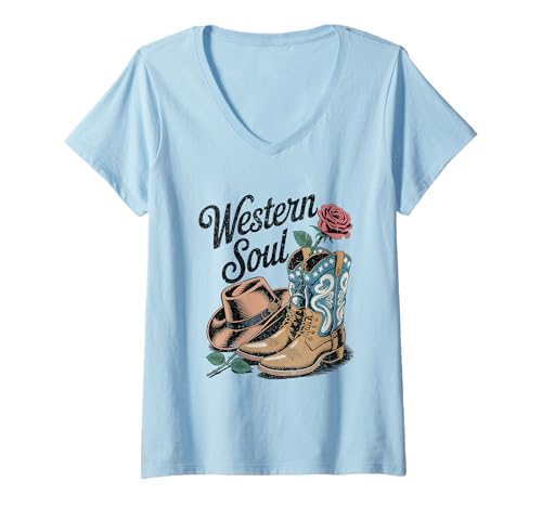 Womens Western Soul Cowboy Boots Hat and Rose V-Neck T-Shirt
