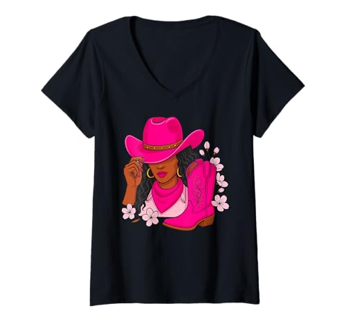 Womens Melanin Cowgirl Western Boots Afro Western Rodeo V-Neck T-Shirt