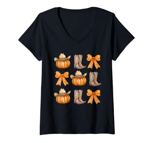 Womens Coquette Bow Western Boots Pumpkin Cowboy Cowgirl Halloween V-Neck T-Shirt