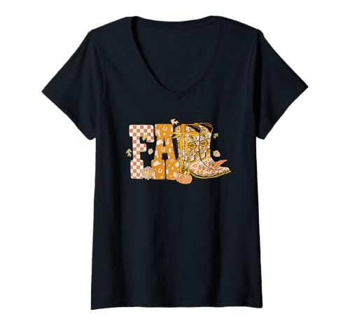 Womens Western Boots Fall Pumpkin Autumn Country Festival Harvest V-Neck T-Shirt
