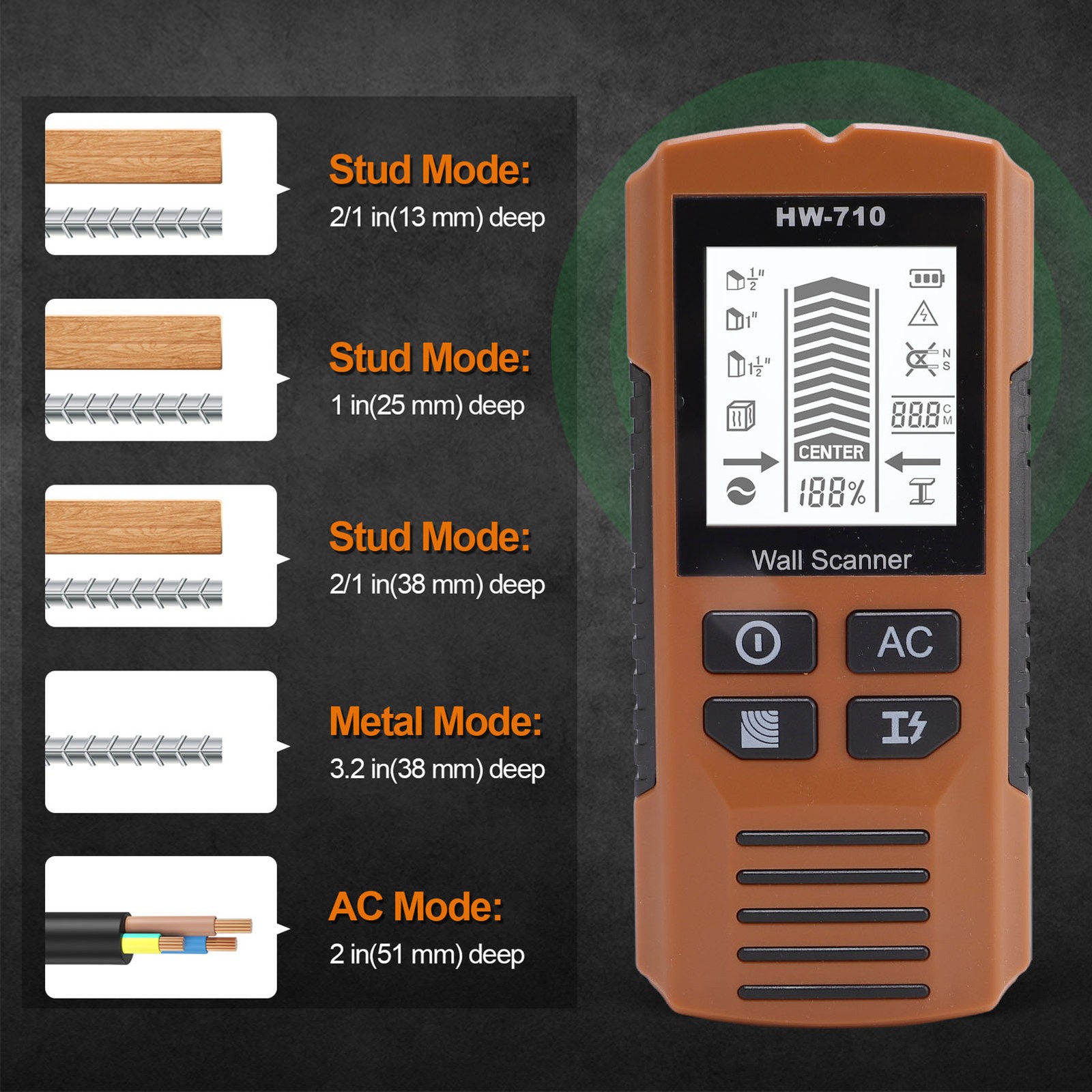 Stud Finder Wall Scanner - 8 in 1 Stud Detector with LCD Display & Audio Alarm, Wire Detector for Wall Wood AC Wire Metal Studs Cable Joist Pipe Detection (Orange)