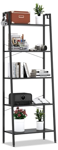 ZERDER 5 Tier Bookshelf,Ladder Shelf, Bookcase with Shelves and 2 Hooks, Storage Rack Organizer, Corner Wood Storage Shelf with Metal Frame (Black)