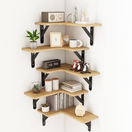 ANYVOYAGE 5PCS Corner Wall Shelves, Rustic Wood Floating Corner Shelf Set with Metal Brackets, Space-Saving Display & Storage for Living Room, Bedroom, Kitchen