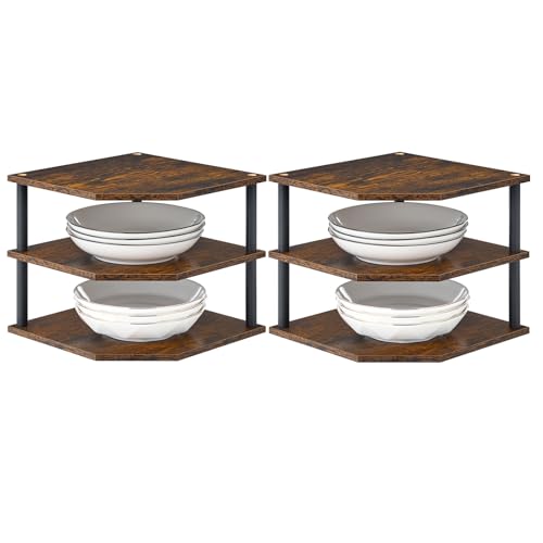 Huukhuom 3 Tier Wood Corner Shelf Cabinet Plate Dish Pantry Organizer Table Shelves Countertop Bookshelf Decor for Kitchen Bathroom Bedroom Home Set of 2